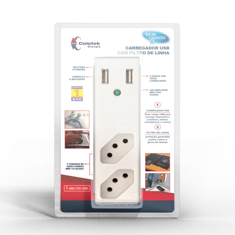 CARREGADOR USB + FILTRO COLETEK FL-USB21GWH